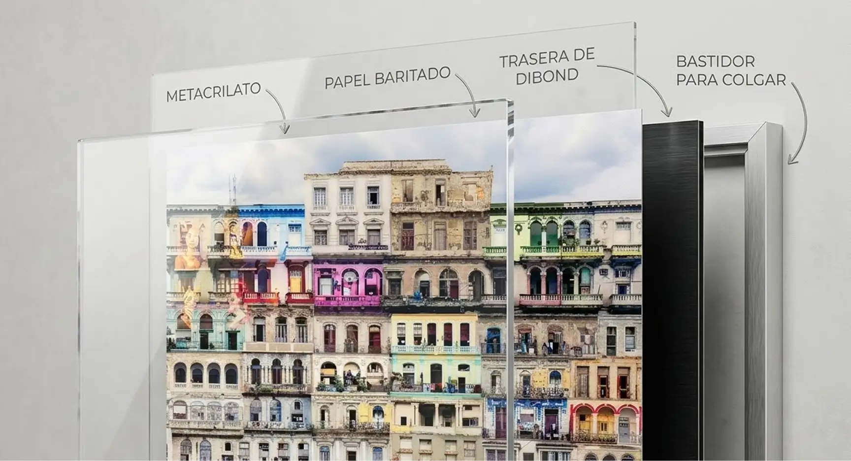 Presentación de máxima calidad utilizada por galerías de arte o museística. Copia en papel baritado siliconado a metacrilato con trasera de Dibond.